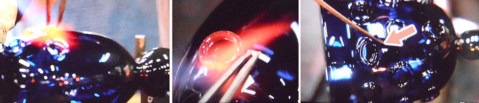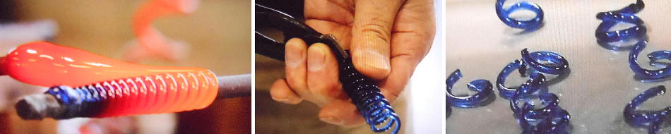 溶けたガラスを棒に巻き、ガラスの蛇を作る。冷めたところでそれを切断し、丸い輪の部品を幾つか用意する。