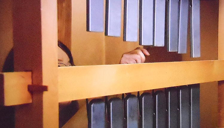 「鉄方響」は、つり下げるための方形の穴を空けた、少しずつ大きさと重さを変えた鉄の板をたたいて演奏する楽器。正倉院宝物の