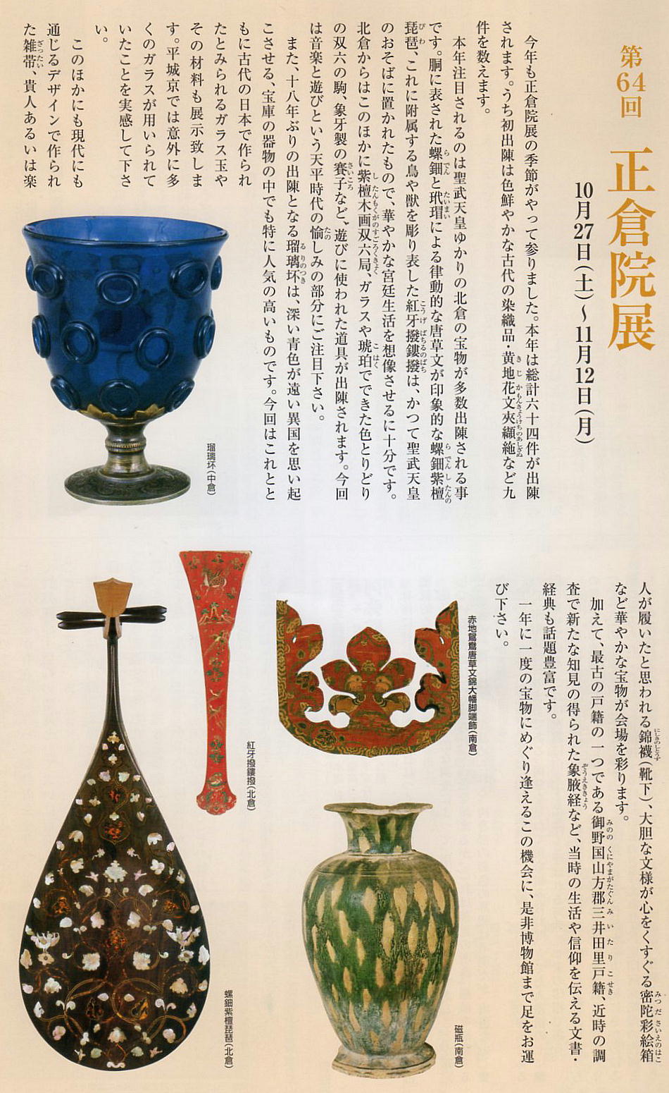 陶器・ガラス器・楽器・仮面など、古代の美術工芸の粋を集めた作品が多く残るほか、奈良時代の日本を知るうえで貴重な史料であ