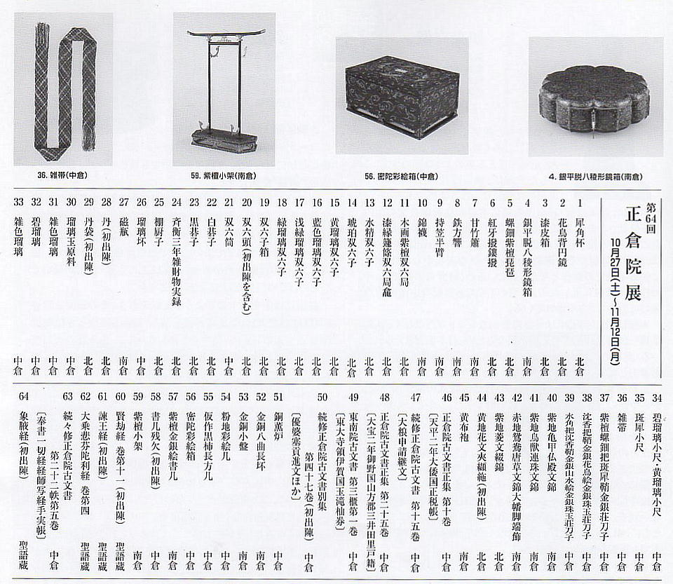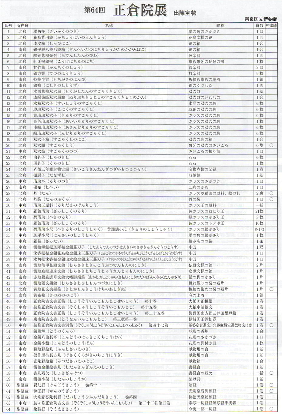 展示宝物: 64件(北倉23件、中倉23件、南倉14件、聖語蔵4件)うち初出陳9件。(第64回に合わせたようである。)