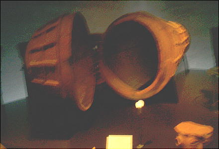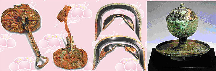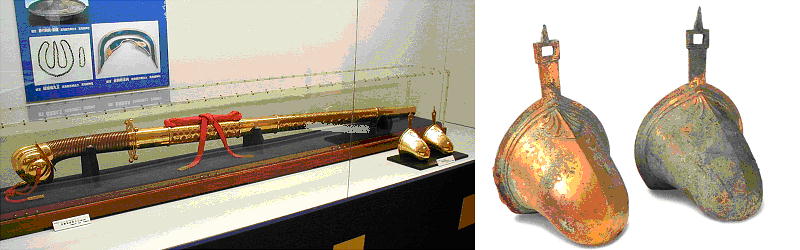 上右は、三重県の宝塚古墳から出土した「古墳時代の船」のレプリカ。<遺跡巡りの「宝塚古墳」を参照されたし。>