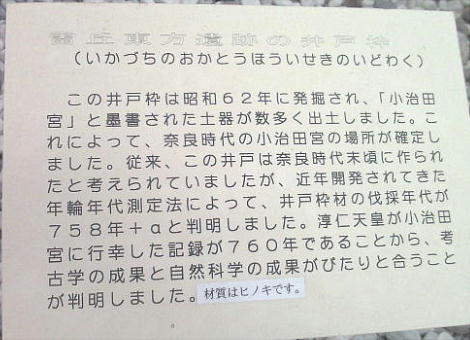 760年(天平宝字4)、淳仁天皇が「小治田宮」に行幸しており、井戸や周辺の建物跡は、この時に整備された仮宮であると
