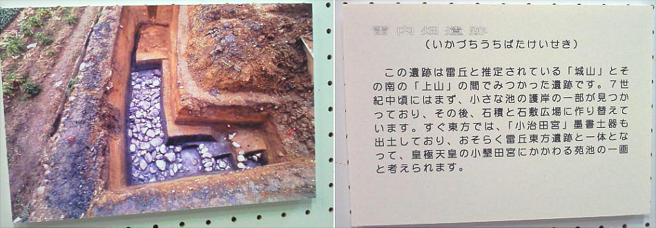 方遺跡」があって、奈良時代の建物跡が発掘され、井戸跡から「小治田宮」と墨書された土器が出土している。なお、「雷丘」