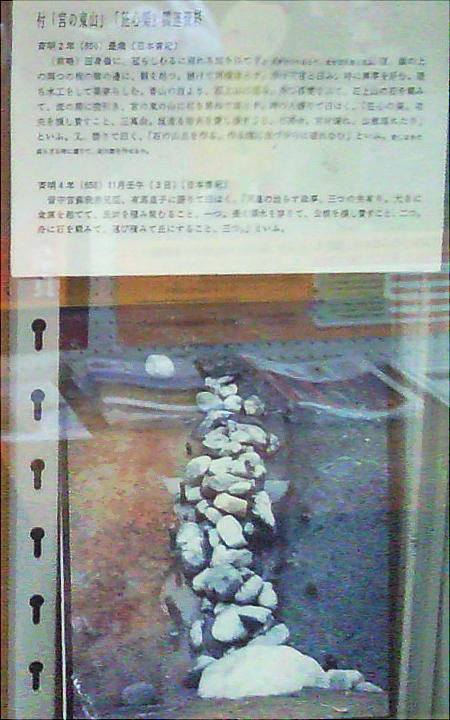 ルにわたって発掘され、この推定が裏付けられた。想像通り、酒船石の丘が「石を累ねて垣」としたという「宮の東の山」で
