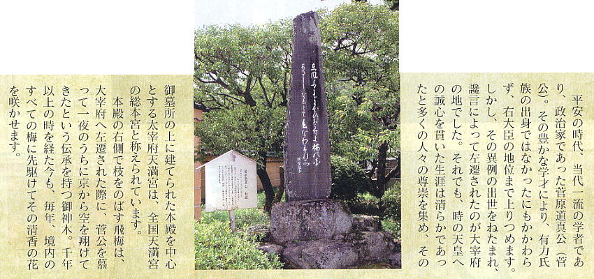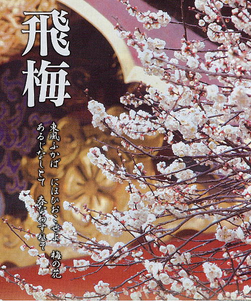 吹かば 匂ひをこせよ 梅の花 主なしとて 春な忘れそ」は有名。その梅が、京の都から一晩にして道真の住む屋敷の庭へ飛ん