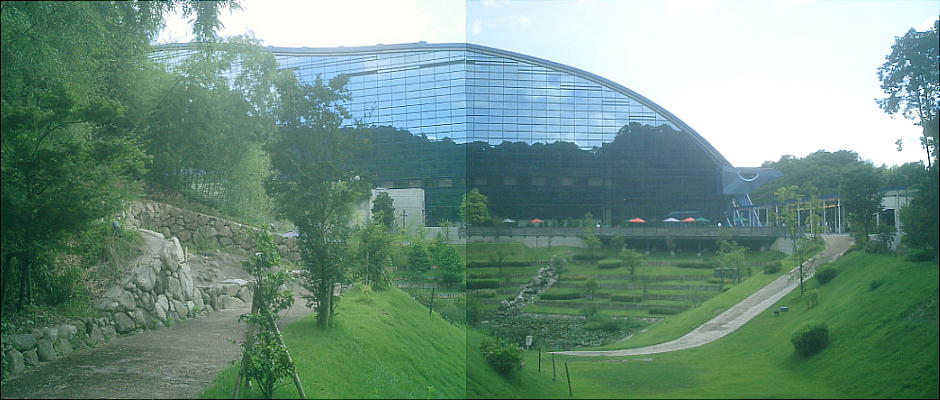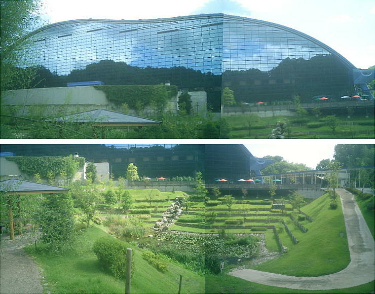 博物館へのエスカレ−ターを登り切って、入り口前の新しく整備された庭園を眺めていると、一角になにやら増築したような石の
