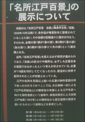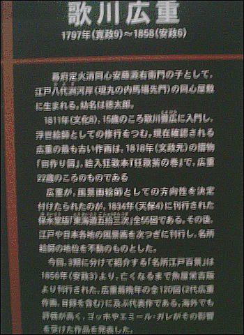 海外でも有名な浮世絵師、広重(1797〜1858)。当館所蔵の広重の代表作「名所江戸百景」を一堂に展示する(一部)。
