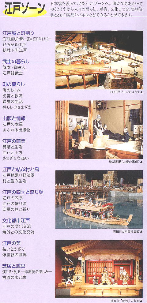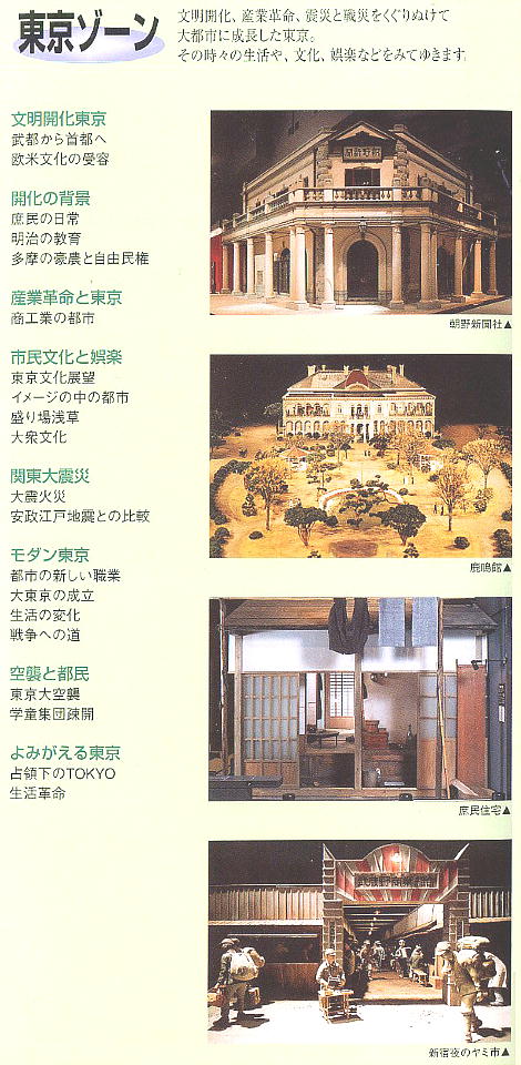城下町としての江戸、武士や庶民の日常生活、火消し、食生活、文化などを窺い知ることができる。東京ゾーンでは明治