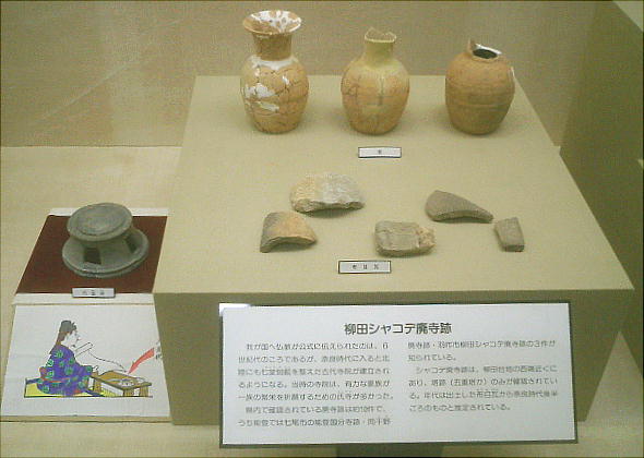 寺家遺跡の硝子破片は乳白色で突起を持ち、ペルシャ産ではないかといわれる。シルクロードを通り奈良を経て伝わった