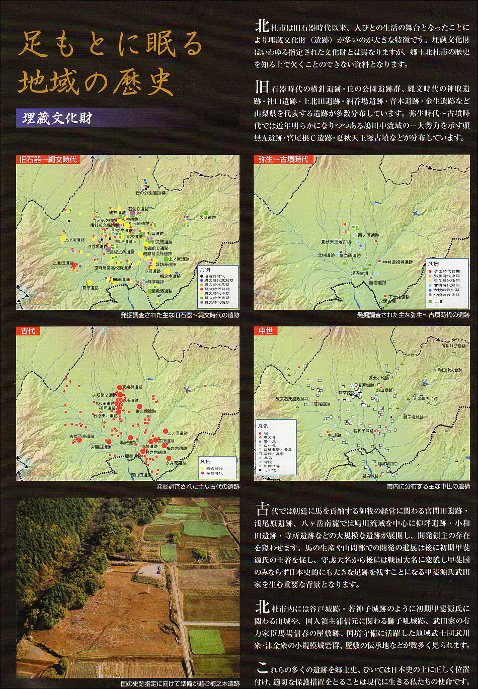 北杜市は山梨県の北部に位置し、3つの大きな地域に分類されている。北杜市には旧石器時代以来の多くの遺跡が残され、縄文時代