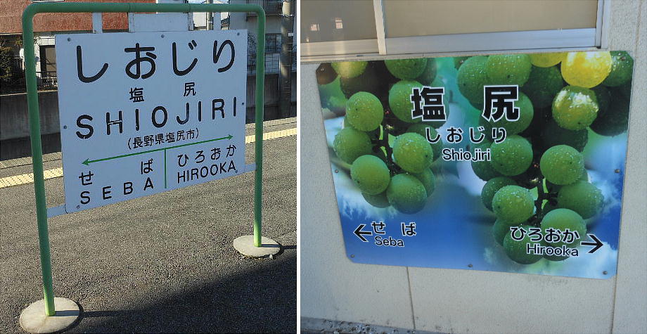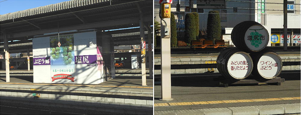 塩尻駅ホーム。ここで名古屋行きの特急に乗り換える。さすが甲州ぶどうの駅ですな。学生時代から、ここにも何十回と降りたね。