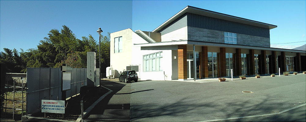 夫婦がワンちゃんを連れて散歩していた。田圃と畑の中に、新築の綺麗な建物が立っている。谷戸城は甲斐源氏の祖・新羅三郎義光