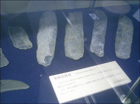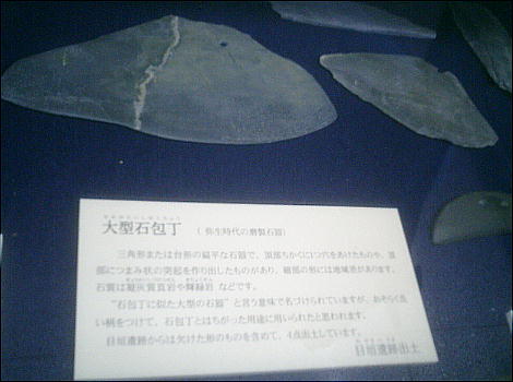 ・石槍などの打製石器はサヌカイト、石包丁は粘板岩・結晶片岩など、又大型石斧は閃緑岩などが使われている。
