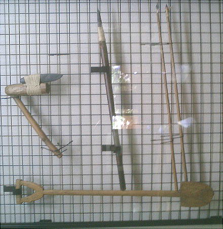 木製のスコップや鋤(すき)、鍬(くわ)などが、他の全国の弥生遺跡(たとえば佐賀・吉野ヶ里、福岡・平塚