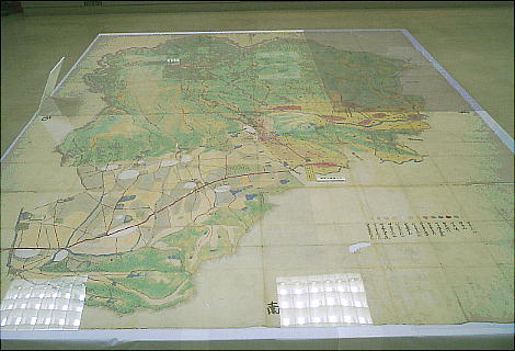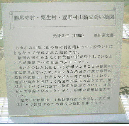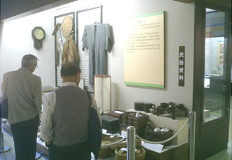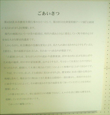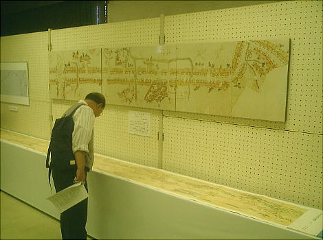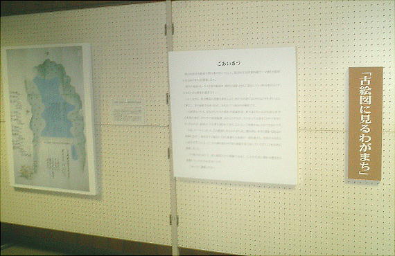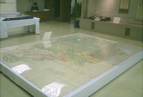 2階展示場では、古絵図展をやっていた。銅鐸のレプリカは、上右の看板の後ろに隠れている。