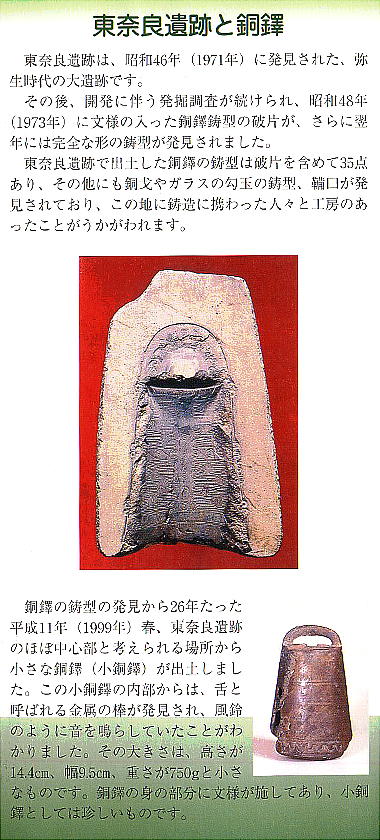 る。銅鐸の解説文を読むと、まずこの遺跡の事は必ずと言っていいほど記述されている。それは、近畿では比較的