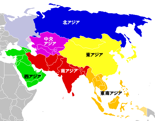 国際連合によるアジアの地域の分類(西アジアは緑)