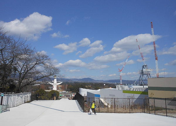 この通路は山道みたいな階段だったのだが、EXPO cityの開業に合わせて綺麗にした。つい1週間前くらいに完成したのだ。