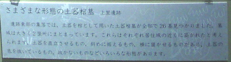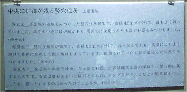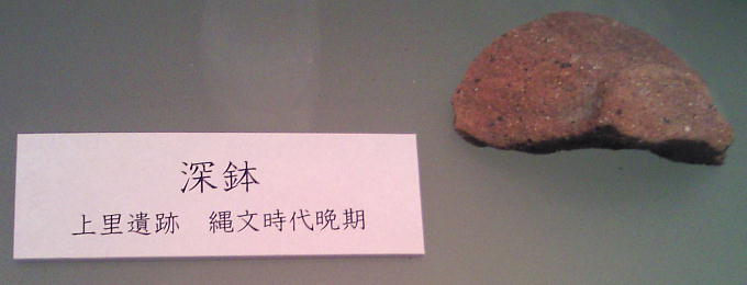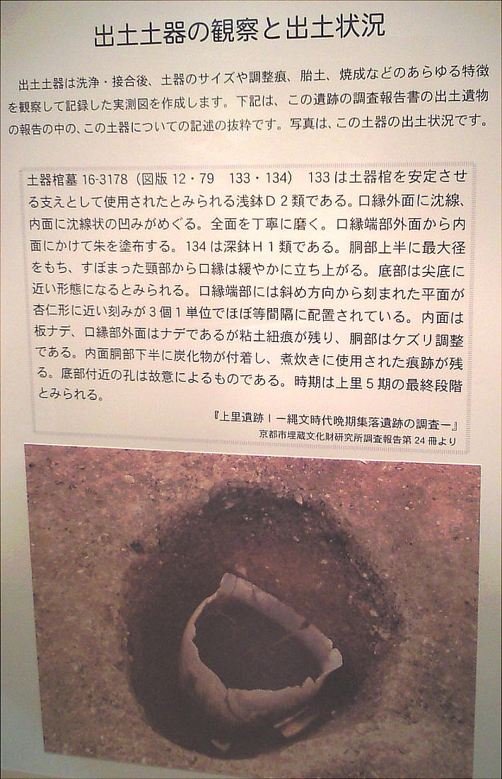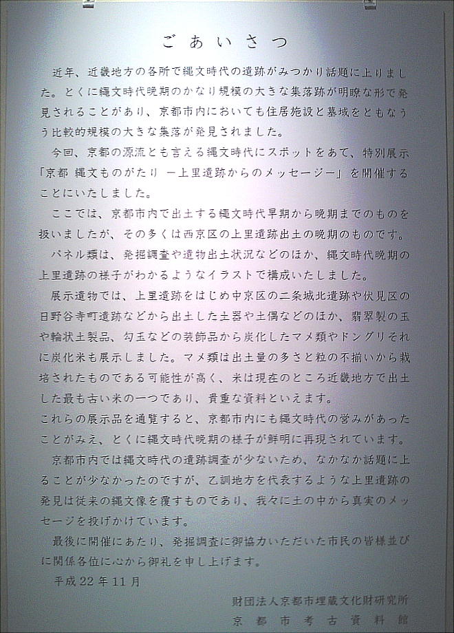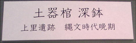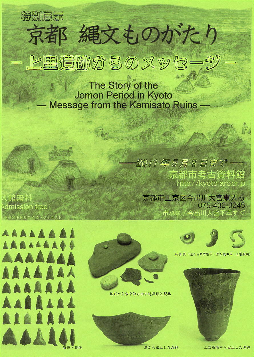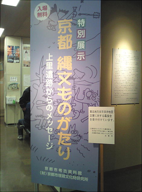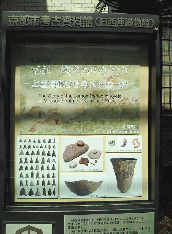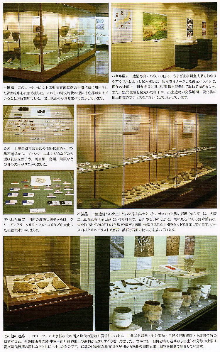 京都市立考古資料館で、以前発掘調査の現場を見に行った京都市西京区の「上里遺跡」の発掘出土品を展示していた。この遺跡は、 奈良とどっちの説明会に行こうか迷って結局ここにし、また風邪気味で躰もしんどく、しかも遺跡を探して相当歩き倒したので、 私にとっては特に思い入れが強い遺跡である。その時の模様は以下にあるが、今回その成果を展示している。 思えば、京都にも縄文人たちが住んでいた証拠だし、無くなってしまった北白川の縄文遺跡などと違ってここは「いま」見れる遺 跡であり、発掘品なのだ。言わば「ホットな」遺跡である。