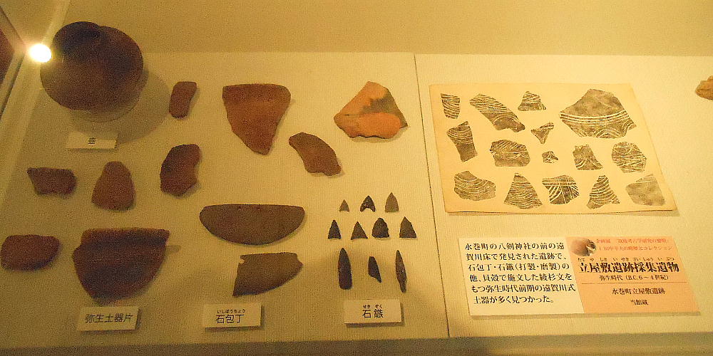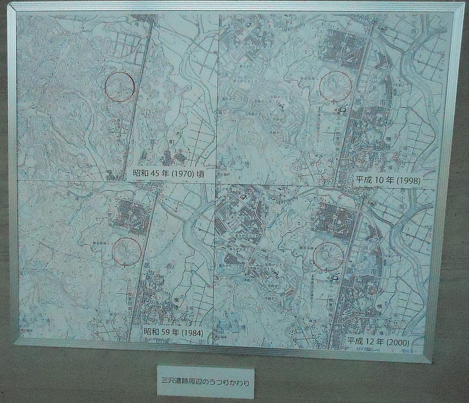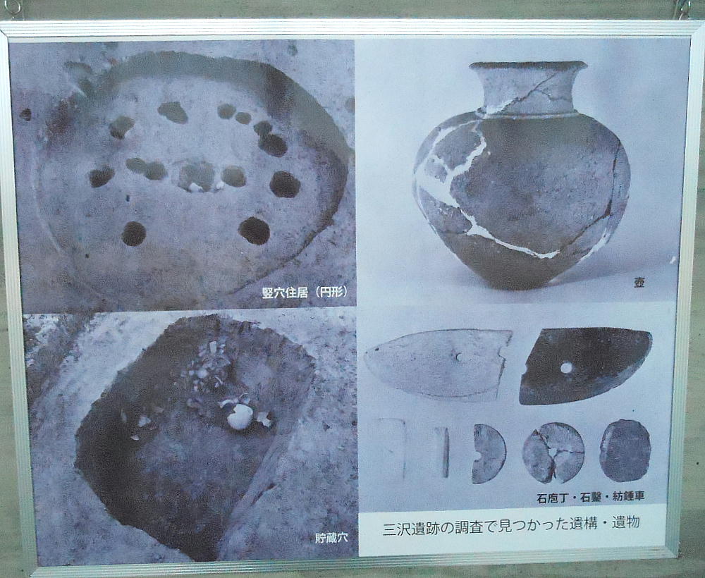辺からは、弥生土器、磨製石器群が、貯蔵穴からはコメ・マメ・イチイガシの実なども検出された。三沢遺跡は、調査された範囲内