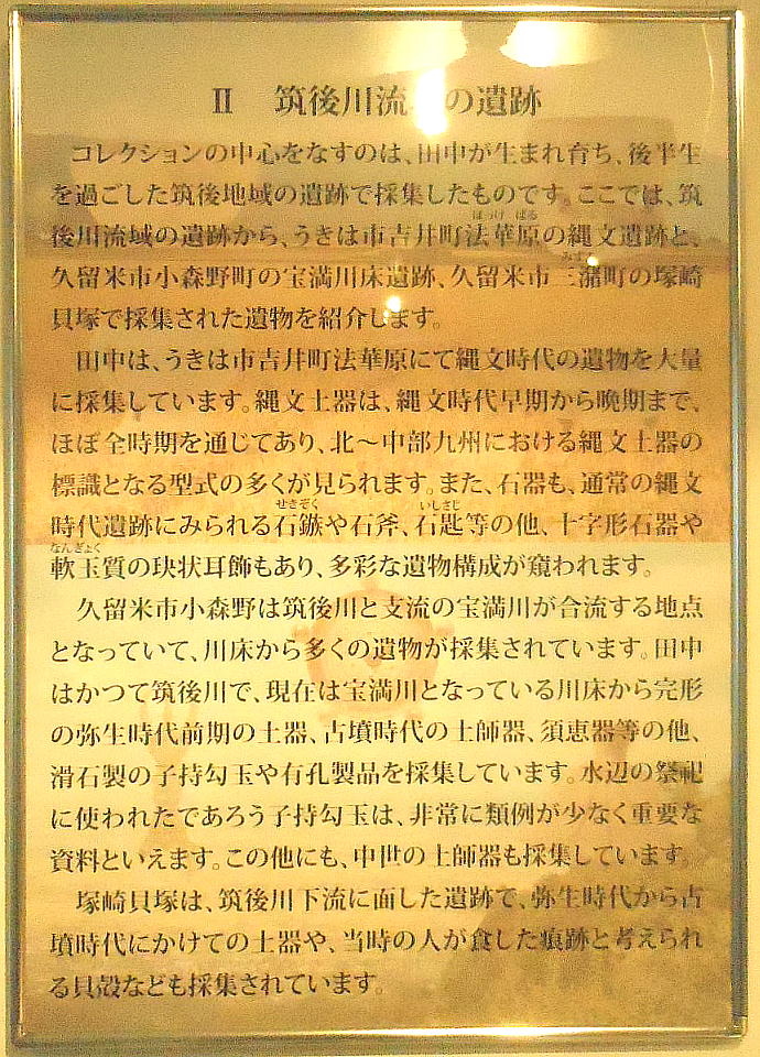 今回の展示では、氏が最も深くかかわった筑後地域の出土資料を中心に、筑後考古学研究の黎明を飾った資料の数々が展示されて
