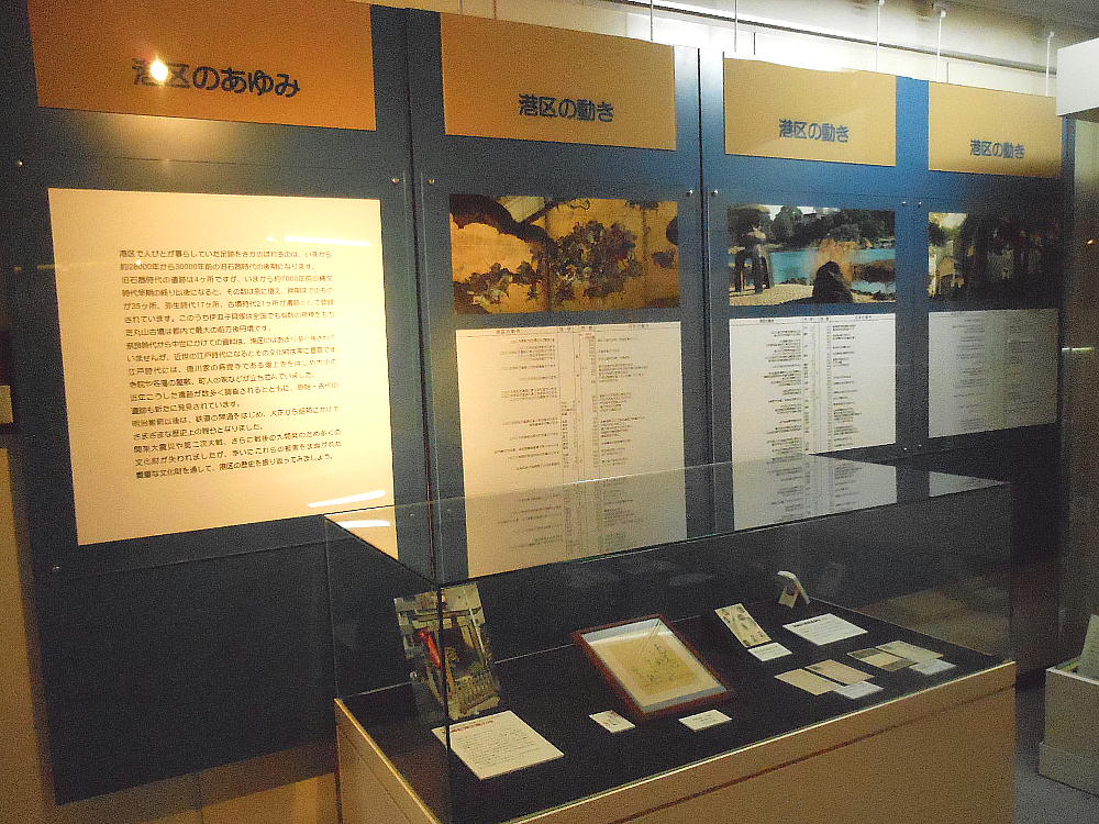 常設展は、縄文時代〜昭和20年頃までの土器、石器、古地図、古文書、写真などが並び、港区の歴史の流れを大まか