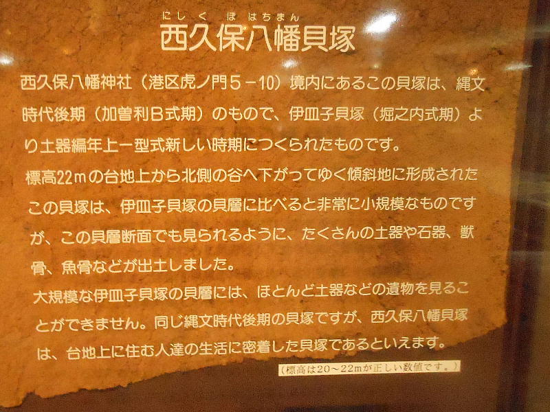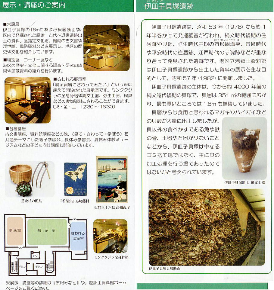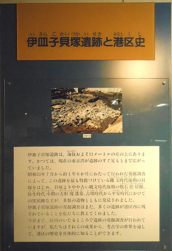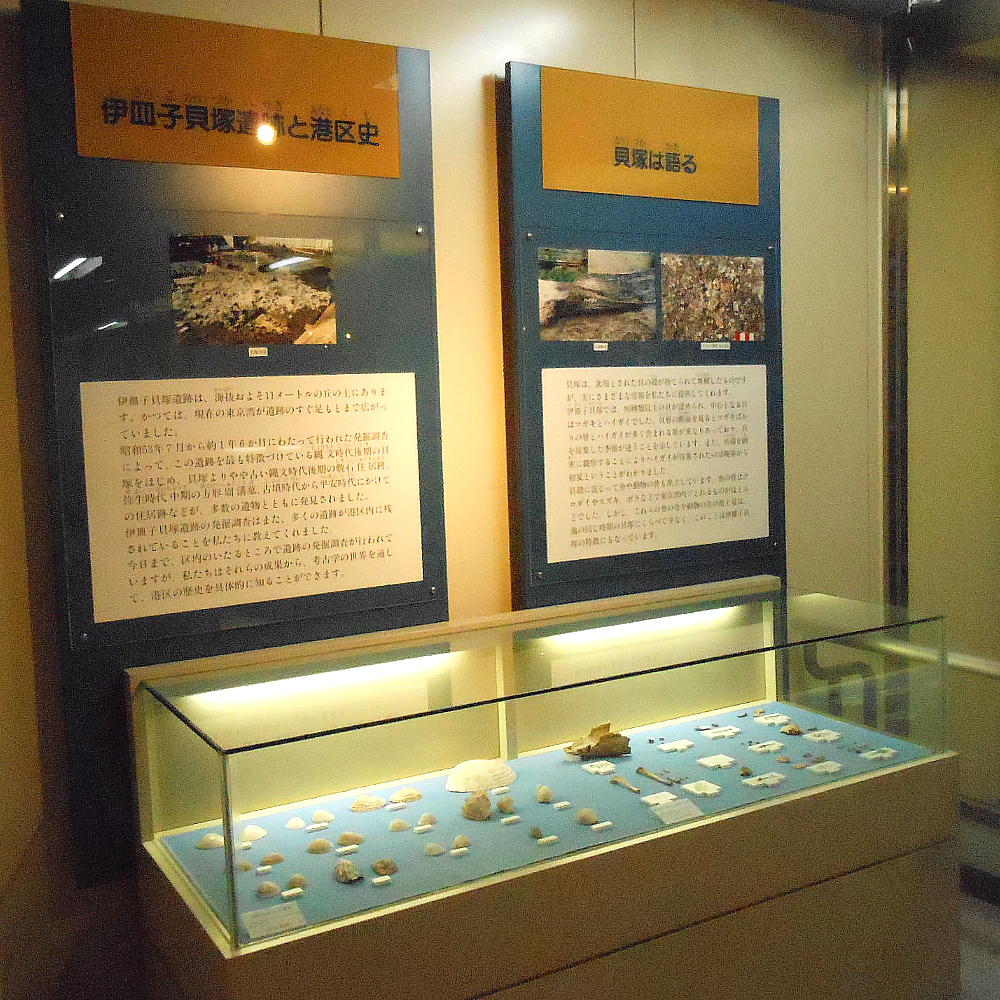 歴史コーナーは伊皿子貝塚遺跡の出土遺物が中心である。貝層の前には、縄文時代から平安時代までの区内出土の考古