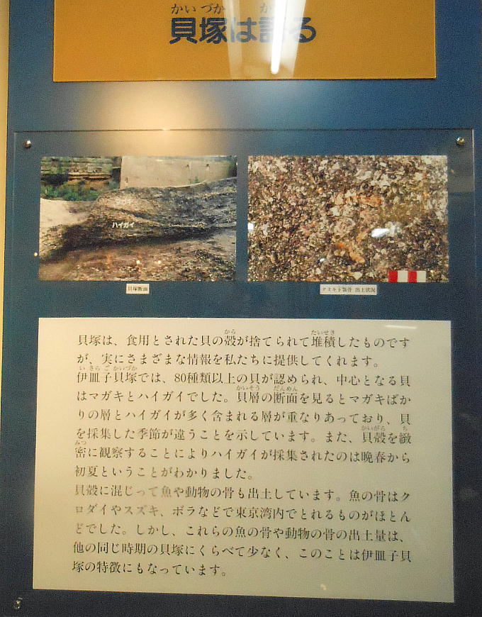 跡で発見された縄文時代の住居跡が復元されており、貝塚の断面も展示されている。貝塚の層には、焼けて変色した