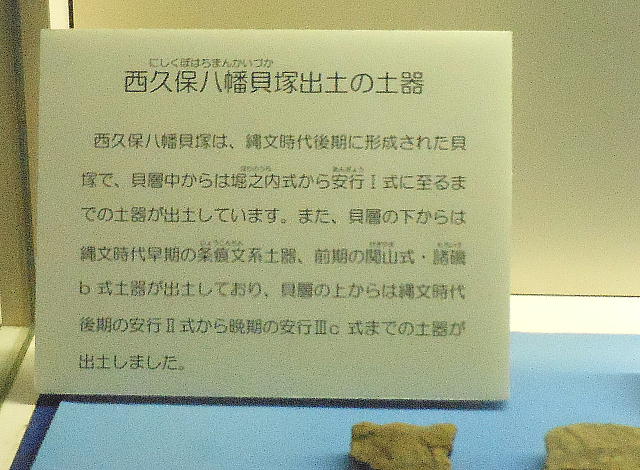 室内には縄文土器、石器、貝殻を加工したアクセサリーなど出土品が並ぶ。右側には、虎の門の西久保八幡貝塚遺跡の