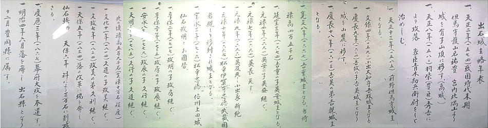 末期には仙石騒動がおこっている。明治時代になり、廃城令で出石城も取り壊されたが、辰鼓櫓、堀、石垣などが現存、また