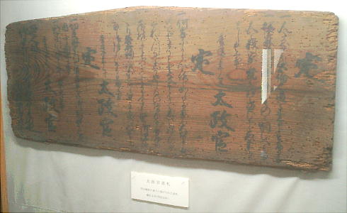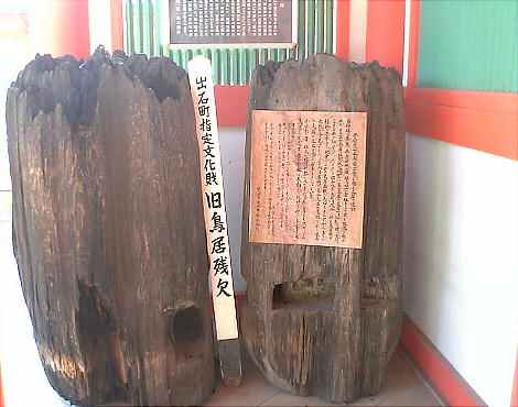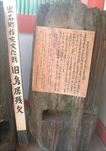 神門入り口に、発掘された平安時代の古い鳥居の一部が置かれている。説明に寄れば、二の鳥居であったと云う。一の鳥居か