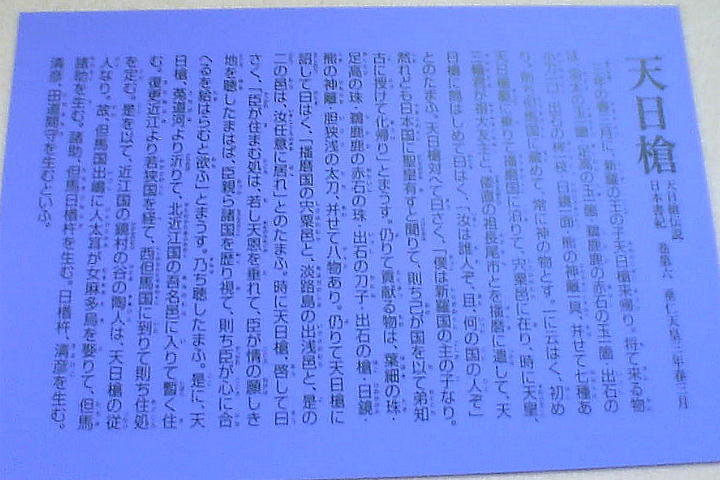 古事記によれば、天日槍(あめのひぼこ:天之日矛)は新羅の国の王子として生まれた。ある日、天日槍は一人の若者から、
