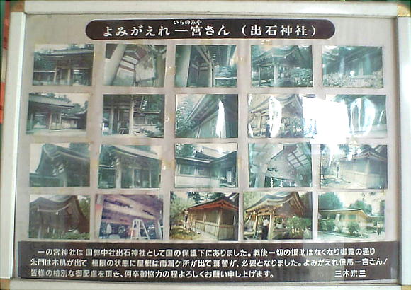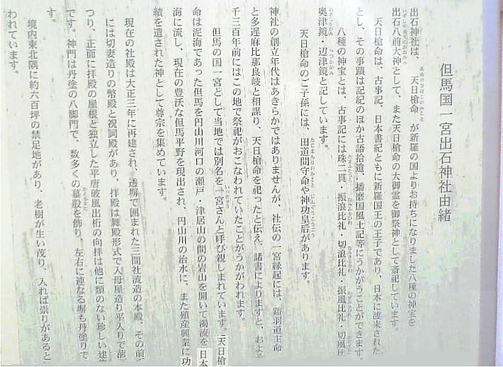 天日槍命を祀ったと伝えており、諸書によれば奈良朝時代すでに山陰地方有数の大社であったことがうかがえる。