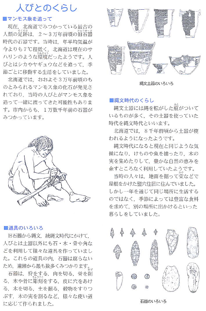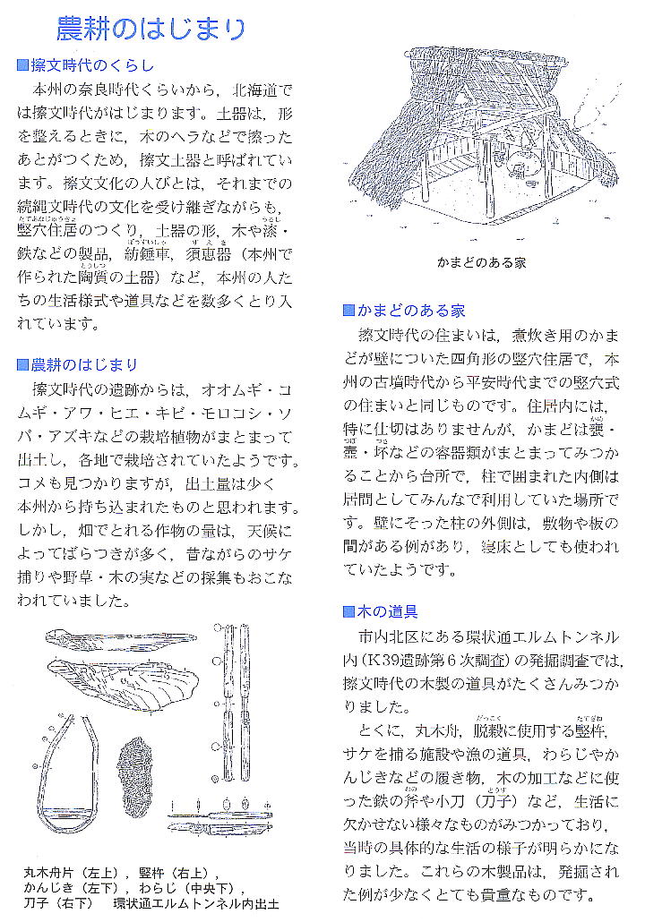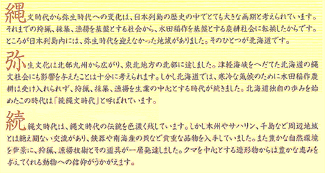 本州では大陸から稲作、金属器が伝わり弥生時代が始まるが、北海道では縄文時代と同じ狩猟、漁労、植物採取が続いてい