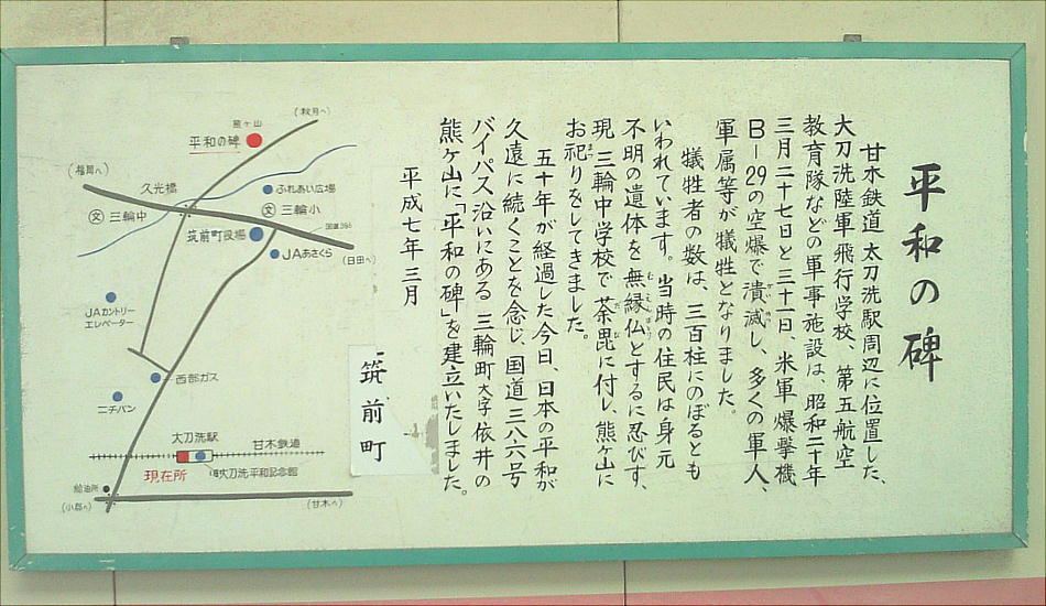 戦時中、同町一帯は旧陸軍の大刀洗飛行場や航空教育隊、航空機工場などがあり一大軍都として発展した。特攻隊員はここで