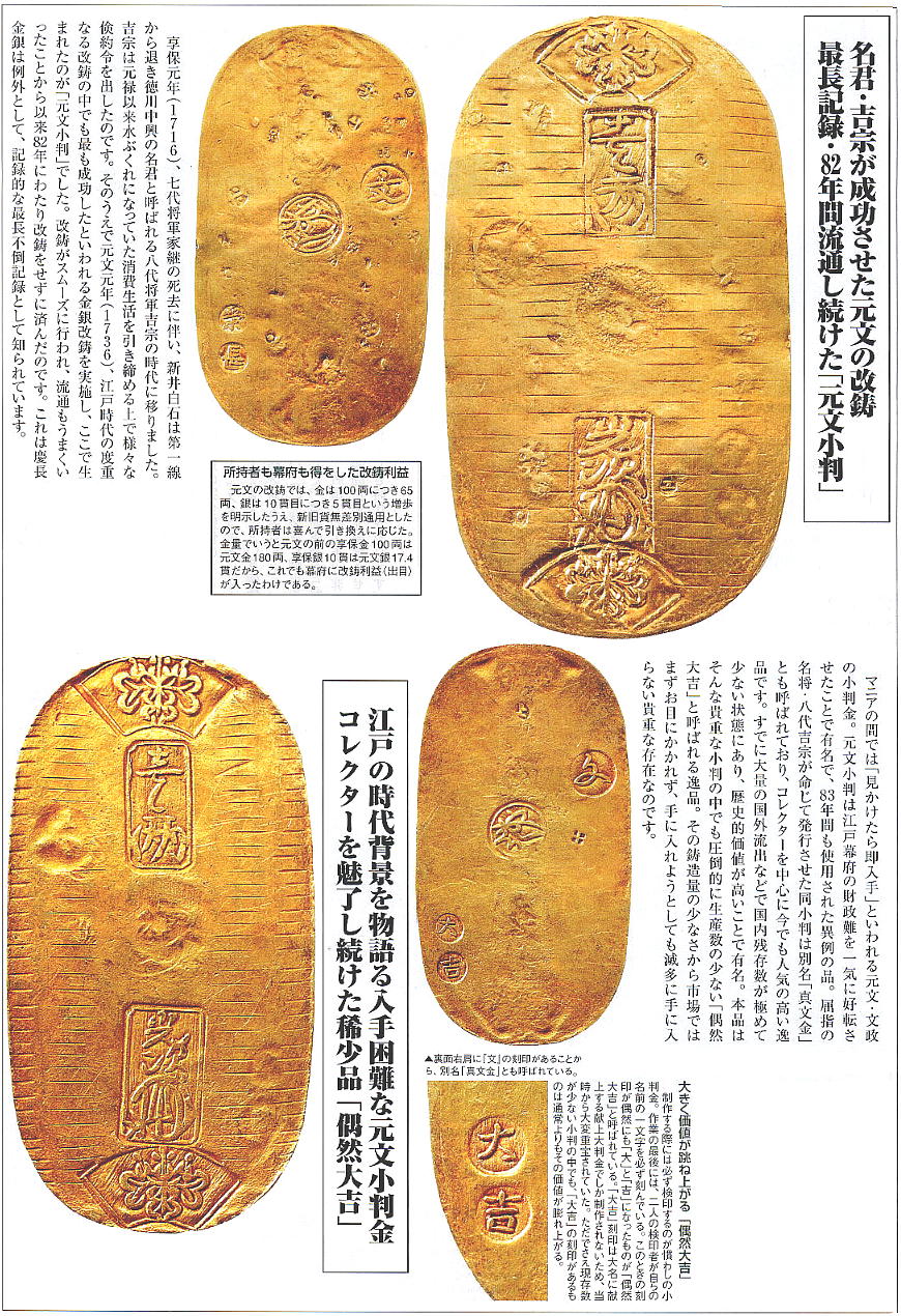 菱大判より上下が長いので、長大判と呼ばれています。世界最大級の金貨幣として知られ、長さは17.5p、幅10.2pあります。