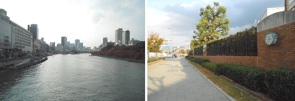 天満橋から北へ行くとすぐ大川である。上左は淀屋橋方面。更に北上して扇町との交差点を右折すると造幣局のレンガ塀が見えてくる。