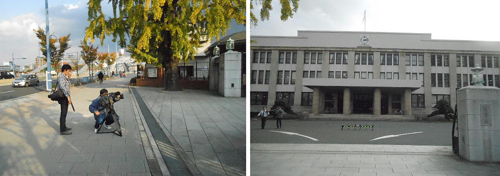 なにやらTVクルーが造幣局を撮影している。interviewかなと思って近づいたがレポーターはいず、ただ建物を写しているだけだった。