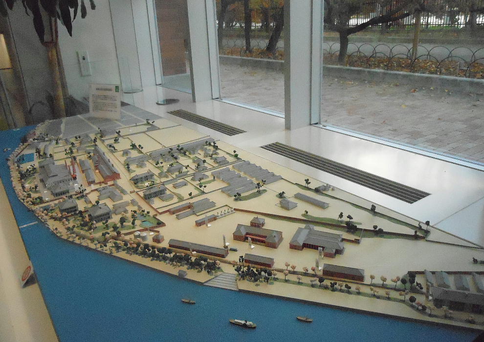 明治6年(1873年)頃の造幣寮の全景で、当時の敷地は約18万m2ありましたが、 現在では約半分の約10万m2です。また、明治