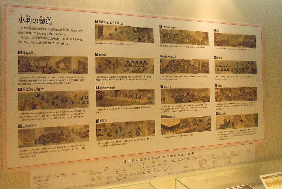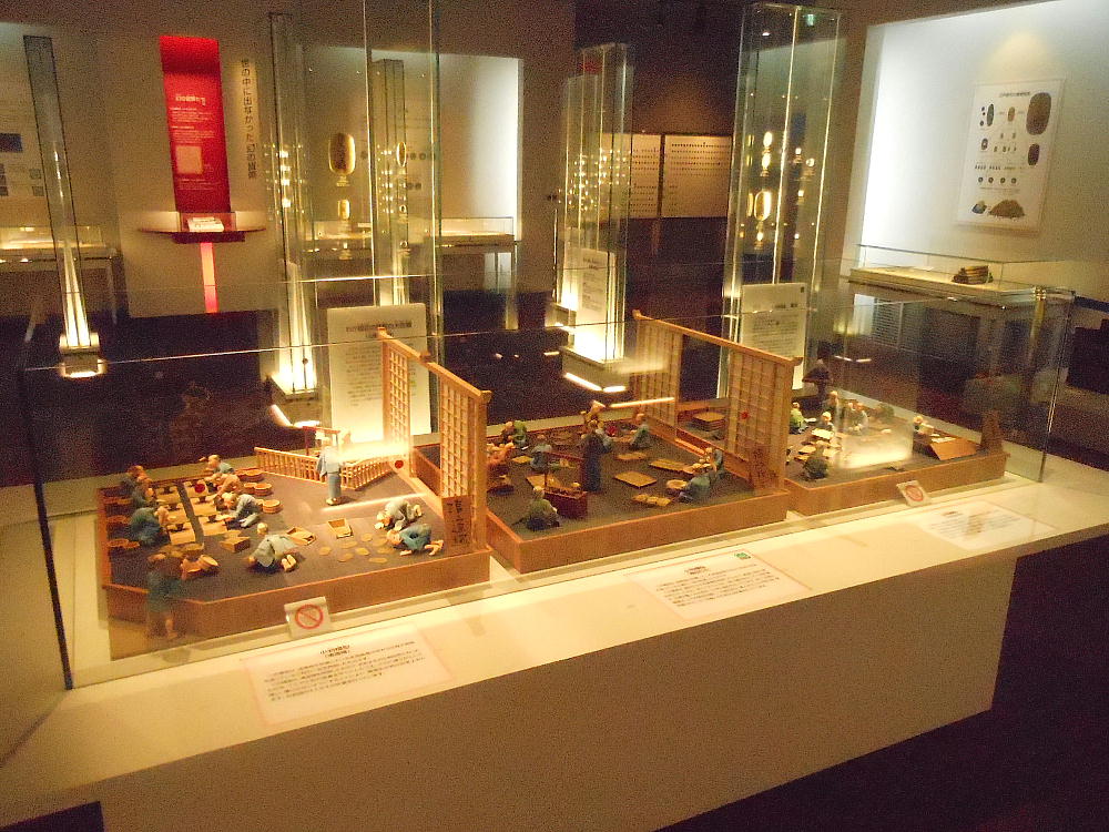 造幣博物館が所蔵している金座絵巻の中から、文政小判金を造っている工程の一部を模型で再現したものです。作業を行っている職人