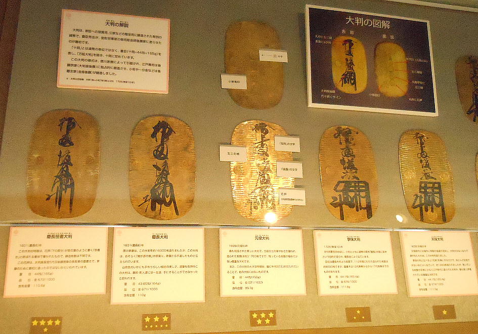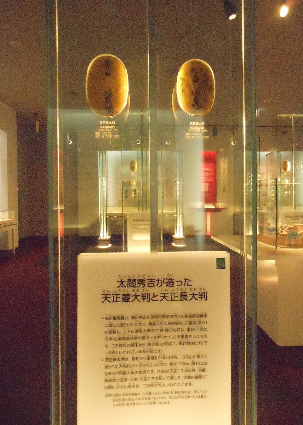 豊臣秀吉の造った大判で金の品位も高く、太閤にふさわしく、貨幣史上最も豪華といわれています。大判の上下に菱形の桐極印があ