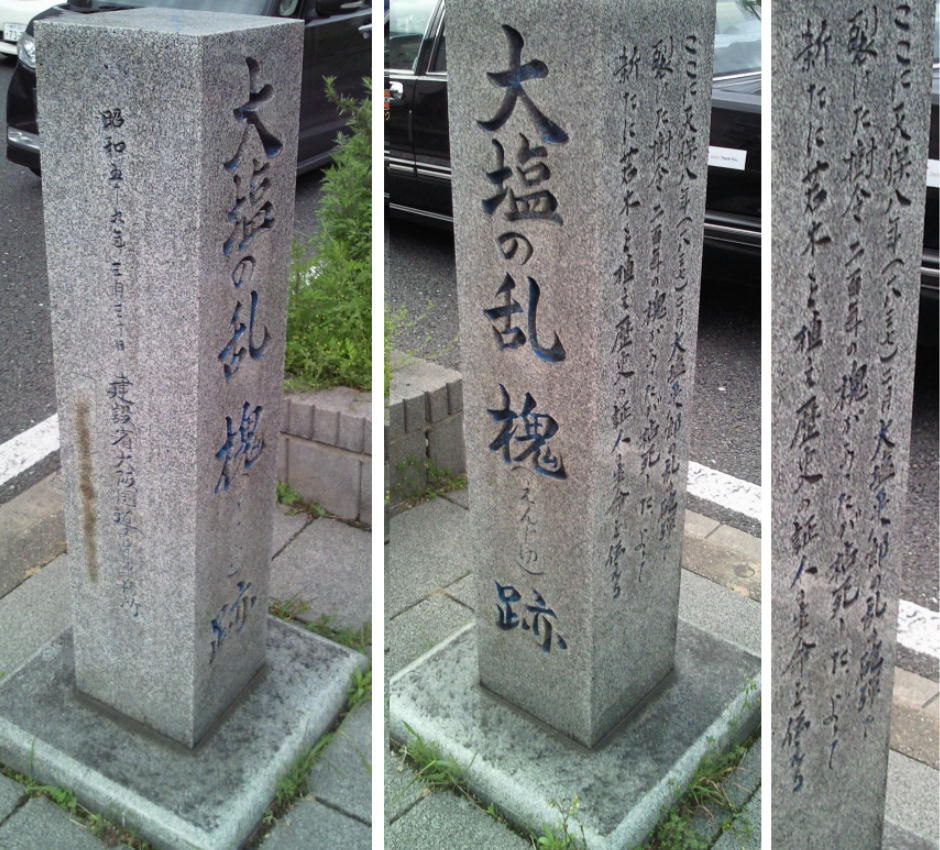 この塀の前に「大塩の乱 槐(えんじゅ)跡」という石碑が立っている。大塩のぶっ放した砲弾で避けた樹木が立っていた。