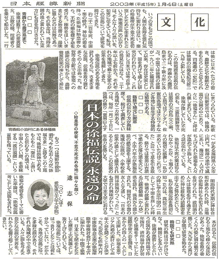 日本の古代史に興味がある人でこの「徐福伝説」を知らない人はいないだろう。特に「縄文・弥生時代」に関心の深い人にとっては、彼らが本当に日本にたどり着いたのかどうか、大いに興味をそそられる話であるはずだ。そんな中、1982年、一人の中国人学者が偶然「徐福村」(現在の中国江蘇州かん楡県徐阜村)を発見した。学者は信憑性 を自問しながらもその重要性に鑑み、研究室の中にプロジェクト・チームを結成して本格的な調査に乗り出した。そして 最終的に、まさしくここが「徐福」の居た村である、という結論を導き出すに至ったのである。この調査結果論文は、日 本外務省・国際交流基金の資金援助によって1985年11月北京で出版された、『中日関係史論文集(第一輯)』(中日関係 史研究会編)の冒頭に「説徐福到黄遵先」として報告された。 (この論文集には、他14名の現代中国を代表する学者・知識人が論文を執筆しており、その内容は「円仁入唐求法巡礼記 録」「阿倍仲麿」「吉備真備」「古事記」「日本書紀」「古今和歌集」「裴世清(はいせいせい)家系」「豊臣秀吉」 「日本中世文学」「刀安仁と宮崎滔天の友情」等々となっている。) この報告は中国内外で大きな反響を呼び、その真偽を巡って論争が巻き起こった。当然この報告に懐疑的な意見もあり、 著者自身もそれは認めている。しかしこの論文をきっかけに、1987年4月「第一回徐福学術討論会」が徐州で開催され、80 人以上の研究者や団体が参加し、50編以上の論文が発表された。その後も数次に渡る討論会が開催され、その結果、徐福の 実在、徐福村の発見、については今日ほぼ事実として認められたと言える。(勿論、反論も依然として存在する。)又、 徐福を先祖とする徐姓一門が名乗り出て、2000年の由緒正しい系図を持つ徐氏一門が、今日なお中国全土に健在である事も 判明した。 (中国における家系と家系図に対する扱いは日本のようにいいかげんなものではない。厳粛な、個人の全存在を賭けたに等 しい扱いなのである。捏造した事がわかれば家系からも社会からもはじきだされ、まともな扱いは受けられなくなる。中国 では大部分の家が、何代にも渡る家系図を保有している。 中国の歴史学者で、我が国にも著名な「汪向栄(おうこうえい)」氏は次のように述べている。 「もしわれわれが真剣に中日関係交流史を、とくに日本の古代における発展過程を縄文時代から弥生時代までたどり、慎重 な観察と検討を加えようとするならば、この徐福伝説を軽率に否定することはできない。徐福が東渡して日本にとどまり、 再び中国へ帰ることはなかったという『史記』の記述についても、そこにはなにか深い原因と理由が存在したのではなかろ うか。現在の徐阜(じょふ)村の人々が悠久の歴史の流れと人の世の激しい変動のなかで、二千有余年にわたって消すこと なく絶やすことなくその地名を残し、徐福という人物についての先祖からの伝承を今日まで伝えているという事実はなまや さしいものではなく、単なる偶然として片づけるべきものではない。」