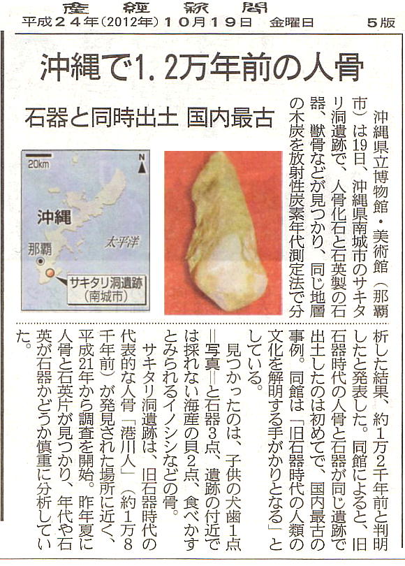 1万2千年前の人骨発見 南城市・サキタリ遺跡 石器と同時、国内初 琉球新報 2012年10月19日
