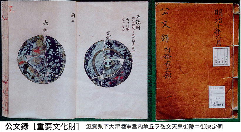 上は東京の国立公文書館にある、「弘文天皇」を皇統に加えてもよいかという明治天皇へのお伺い書。これで大友皇子は「天皇」となった。