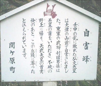 翌23日山城国山前(現京都府大山崎町)で、大和の大伴吹負(おおとものふけい)の軍に行く手を阻まれ、ついに大友皇子は自害する。