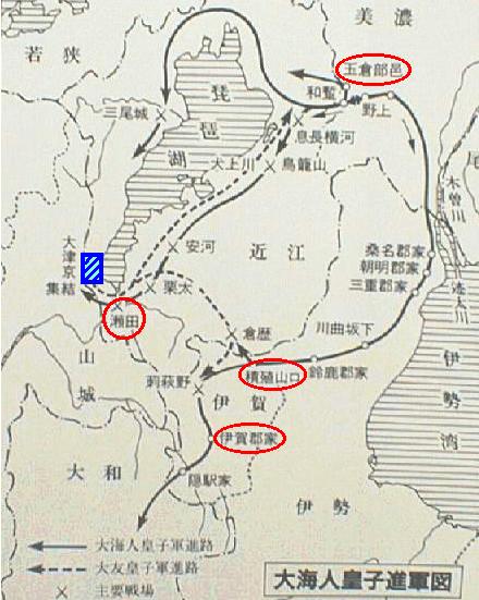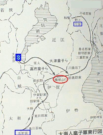 で近江から来た高市皇子一行と合流して伊勢に向かう。26日大津皇子も合流。不破の関を確保し高市皇子が総大将として不破関へ向か
