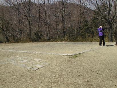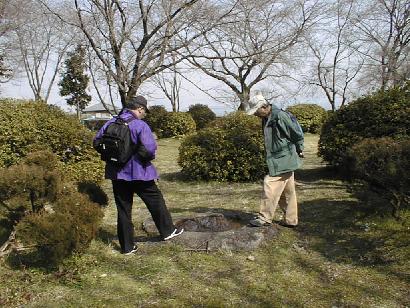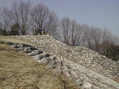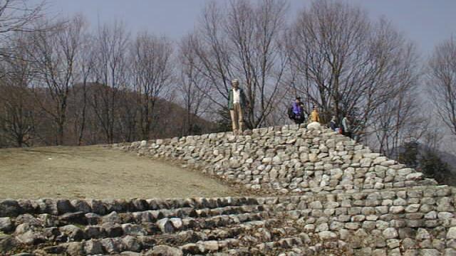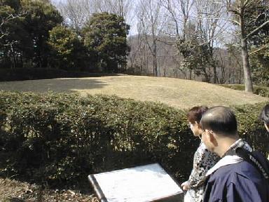 小高い丘の頂上と中腹に古墳があった。2,3分で頂上だが、昼食後すぐ登ったので少ししんどかった。頂上の古墳は葺石を並べて復元してある。