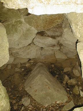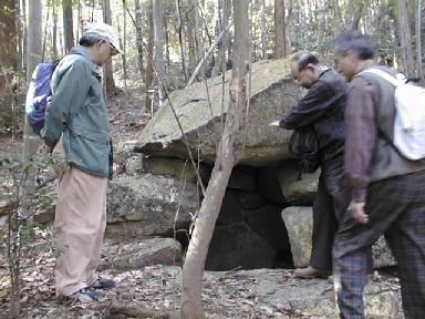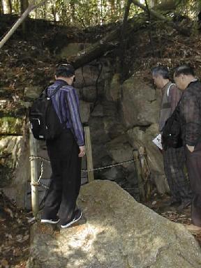 服部さんがのっかっている大きな石は、天井の前方部を覆っていたものが崩れて下に落ちたもの。