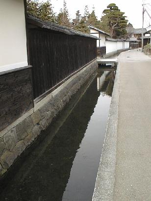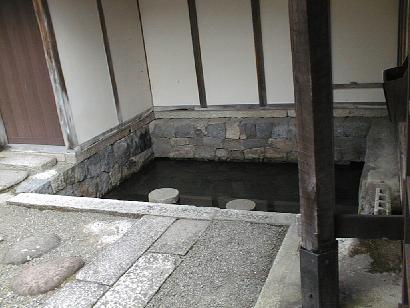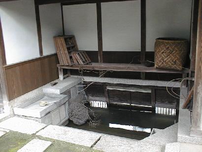 家の廻りをめぐる水路から、家の内側に水が流れてくるように造ってある。大根などを洗う洗い場のようだ。上流から取り込んで下流に出ていくようになっていた。
